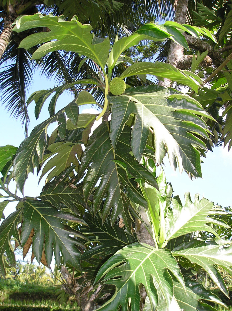 Artocarpus altilis is the scientific name of the breadfruit plant, this plant belongs to the moraceae family, the leaves of this plant are large, and each leafvein has a and yellow flower, long and oval shaped green thorny fruit