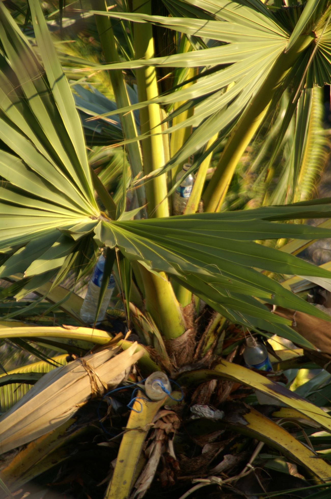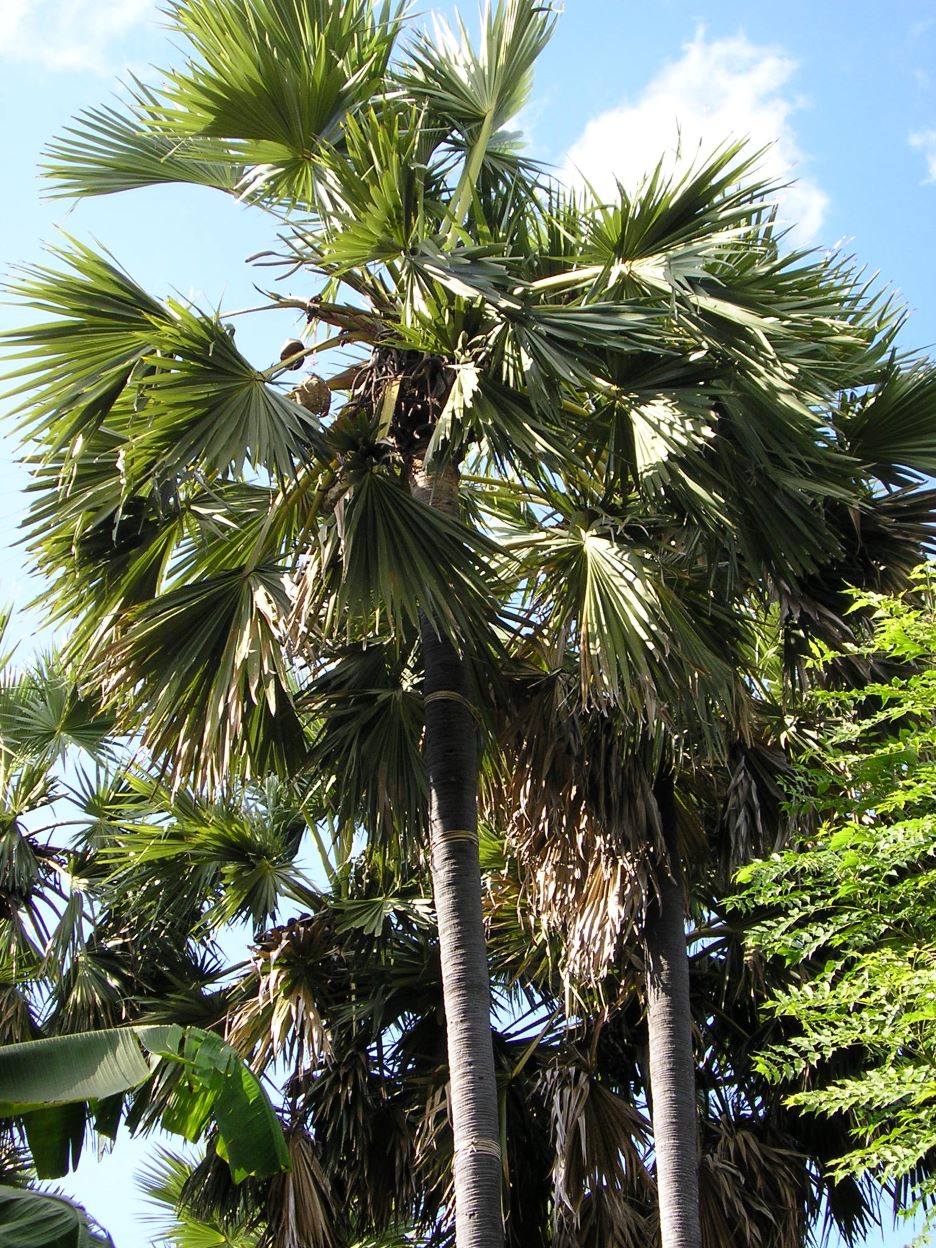 Borassus flabellifer is commonly called the lontar palm, siwalan palm, or large fan palm. This plant typically grows to approximately 18 meters tall and 7.5 meters wide. Its straight, single, gray trunk (up to 9 meters in diameter) is surrounded by leaf spots and a rounded crown of stiff, palmate leaves (each 2.4-3.5 meters long) with thorny stalks. This palm is native to India, Sri Lanka, and Southeast Asia. Nearly white flowers appear in clusters hanging from the leaf axils in late rainy season to early dry season. Male and female flowers grow on separate (dioecious) trees. Male flowers are small (less than 1/2 inch). Female flowers are larger (up to 1 inch) and produce fleshy, slightly round brown fruit (up to 6-8 inches wide). The sex of the tree can only be determined after flowering.